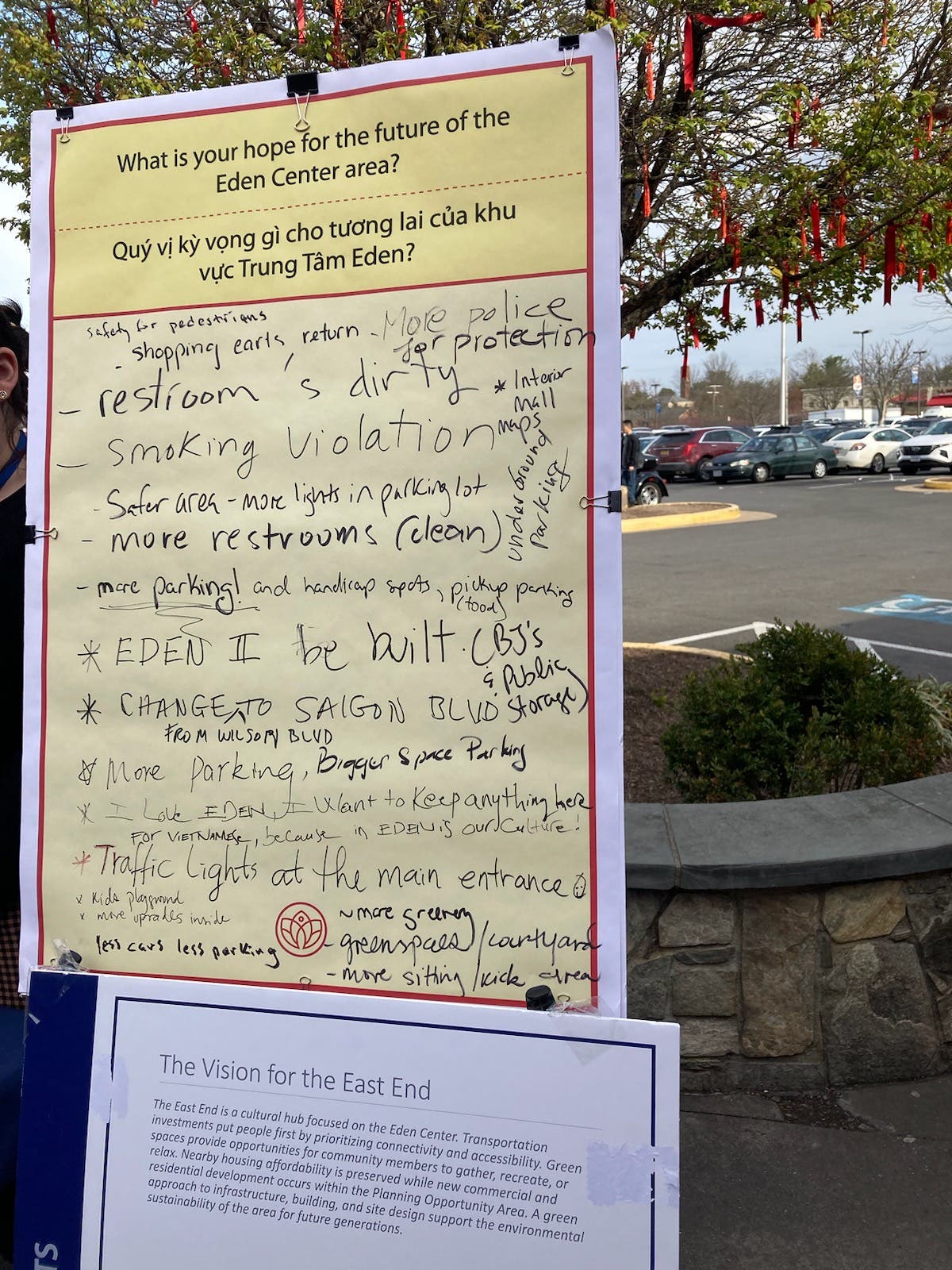 Nguyen said the new outreach events were a more "genuine" effort to understand the community's needs. That approach appeared to work as visitors filled an idea board with their hopes for the Eden Center's future. Nguyen even saw one elder go around to businesses to write down their input on cards for the city.