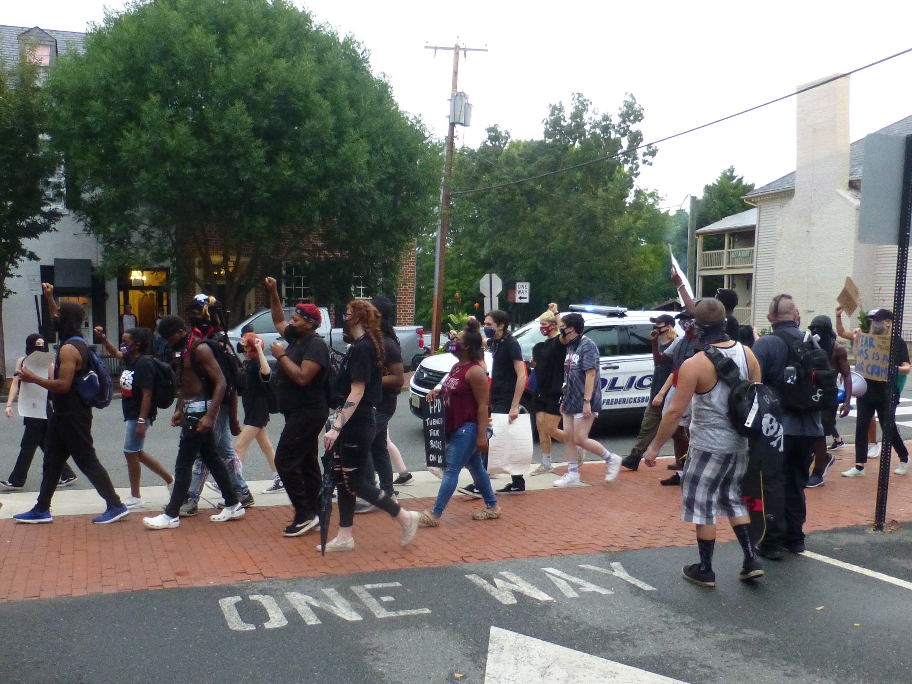 The Black Lives Matter supporters marched on downtown Fredericksburg sidewalks while being monitored by armed men and the police.