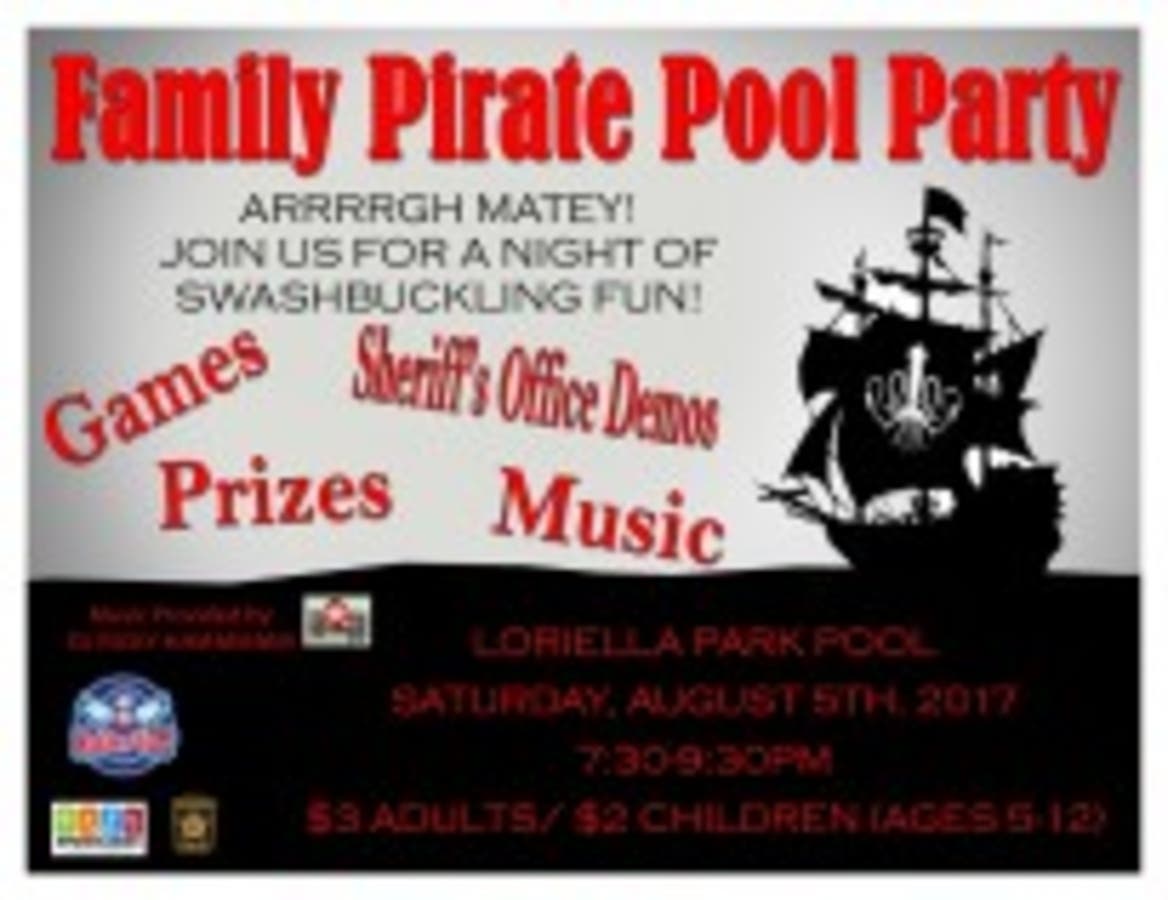 It's the Family Pirate Pool Party, 7:30-9:30 p.m. Saturday at Loriella Pool in Fredericksburg, 10910 Leavells Road. It's put on by Spotsylvania Parks and Recreation and the Spotsylvania Sheriff's Office, and the latter will be having demonstrations by its specialty units.