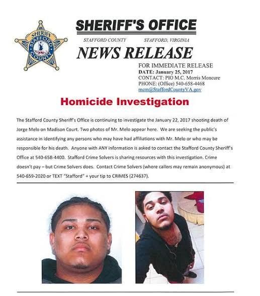 Authorities are seeking the public's help related to the murder of Jorge Melo on Sunday, according to the Stafford County Sheriff's Office.