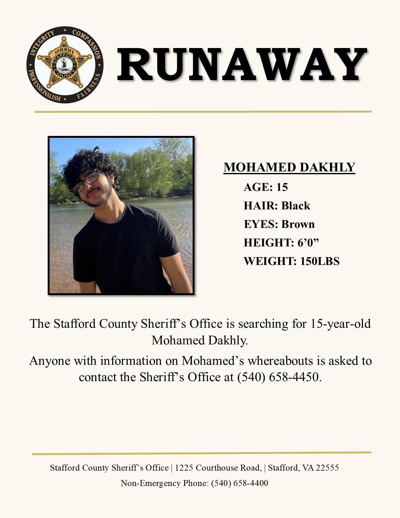 STAFFORD COUNTY, VA — Mohamed Dakhly, a 15-year-old from Stafford County, is missing, authorities said on Friday. The Stafford County Sheriff's Office is asking for the public's help finding him.