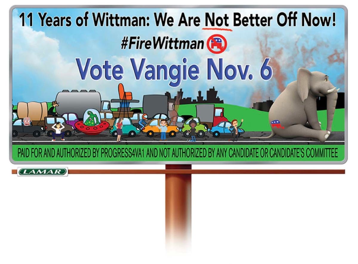 Progress4VA1, an independent expenditure only political action committee (PAC), has purchased and contracted with Lamar for a road-side billboard that will be displayed the entire month of October 2018 alongside Route 1 at Centerport Parkway in Stafford, VA. The billboard shows animation of backed-up traffic being blocked by a Republican elephant. It includes the words… 11 Years of Wittman: We Are Not Better Off Now! #FireWittman – Vote Vangie Nov. 6.