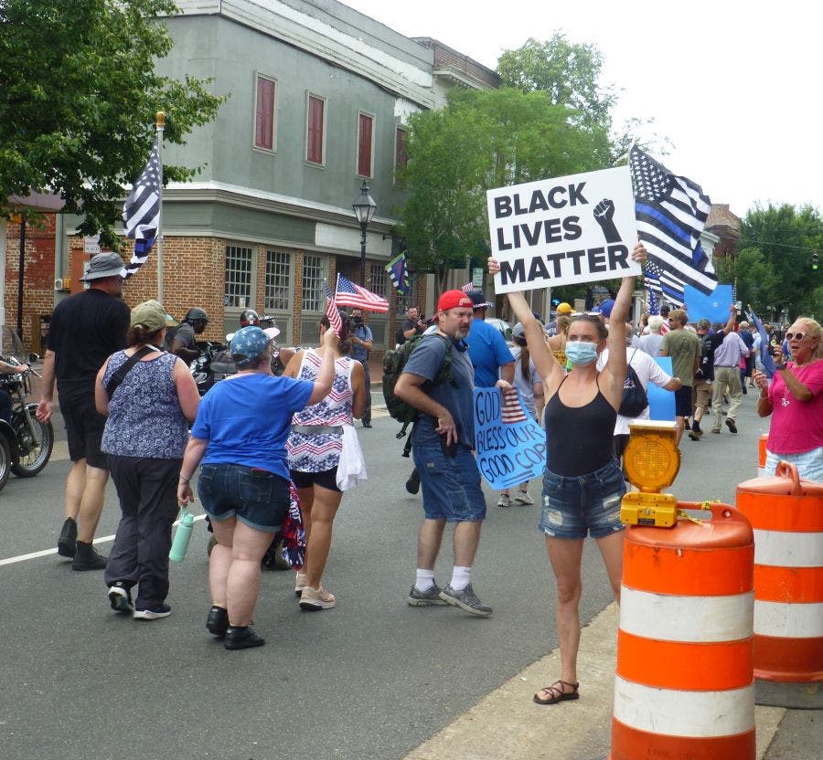 As it turned out, the event was peaceful, with a couple dozen Black Lives Matter counter-protesters holding signs or chanting along the march route. The parade-like atmosphere of the march reflected the easing of tensions in Fredericksburg over the past two weeks as the city has taken measures in response to demonstrations for racial justice, including the adoption of a plan to address racial inequality and discrimination.