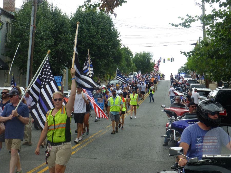 The organizers kicked off the Back the Blue event with a rally in Hurkamp Park in downtown Fredericksburg, where participants were provided instructions in case counter-protesters disrupted the march. As many as 100 bikers lined the march route with the mission to keep the marchers safe.