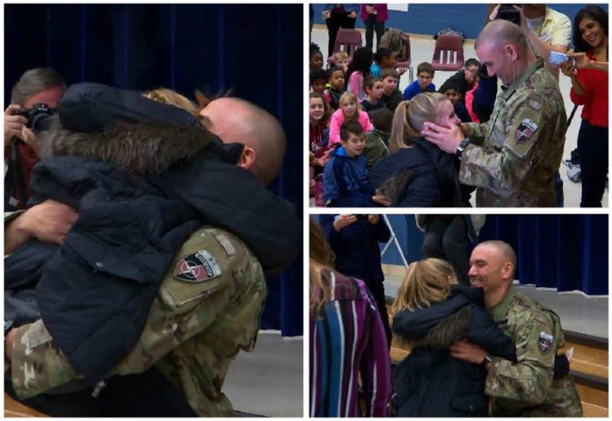 A fourth-grade girl was surprised at a Stafford elementary school Monday by her dad's return from Afghanistan after six months.