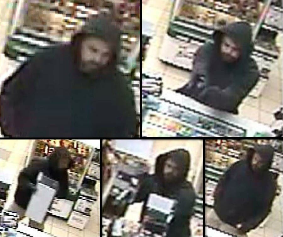 The suspect is described as a white male in his 30s, about 5 feet 5 inches to 5 feet 8 inches in height, with a reddish/brown in color beard or goatee. On the night of the robbery, he wore a black hoodie shirt, khaki pants and gloves.