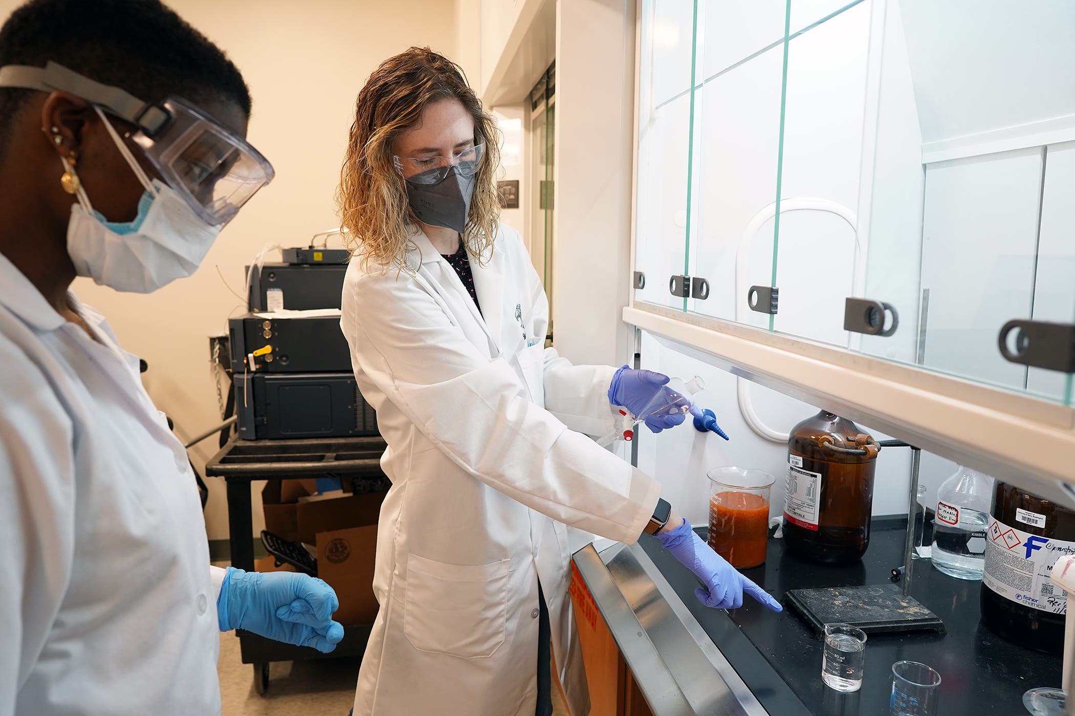 The pair is using a ventilator hood and protective wear while working in the university’s Jepson Science Center Labs to protect themselves from the highly irritant chemicals while testing the heat content of the Signal One 2.0.