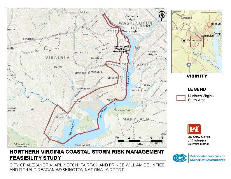 The DC metropolitan region, including Northern Virginia, was identified as a high-risk area in a previous study requested by Congress after Hurricane Sandy. A key concern is the Potomac River and its tributaries. The study includes coastal areas of Arlington County, Alexandria, Fairfax County, northern Prince William County and Reagan National Airport. Problem areas identified for the study are the Arlington and Alexandria waterfronts along the Potomac River, as well as Cameron Run and Four Mile Run, which empty into the Potomac.