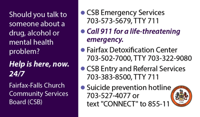 Residents can also get assistance finding treatment options by calling 703-573-5679 and can obtain Fairfax-Falls Church Community Services Board's overdose resource cards. If you believe you or someone is overdosing, call 911 immediately.