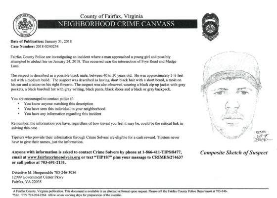 Below is the flyer going out to residents. Anyone with information on man in the sketch or the incident should call Detective Hengemuhle at 703-246-3086, Fairfax County Police at 703-691-2131 or submit an anonymous tip online through Crime Solvers.