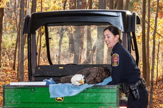 The eagle reportedly hopped around among the brush piles, trees and tried to swim off, as the she pursued it. When a helpful park visitor blocked exit routes for the eagle, the officer was able to make the capture.