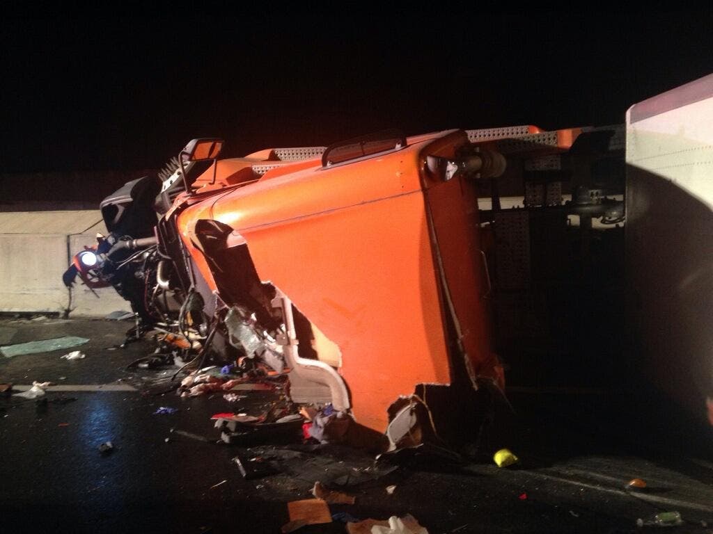 The first units on the scene found "a tractor trailer that had flipped over after apparently hitting a guardrail," the Fire Department said. The driver was trapped inside the rig.