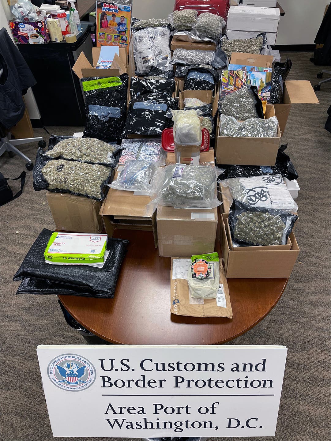 U.S. Customs and Border Protection officers at Dulles Airport in Virginia intercept 150 pounds of marijuana in mail headed for London.