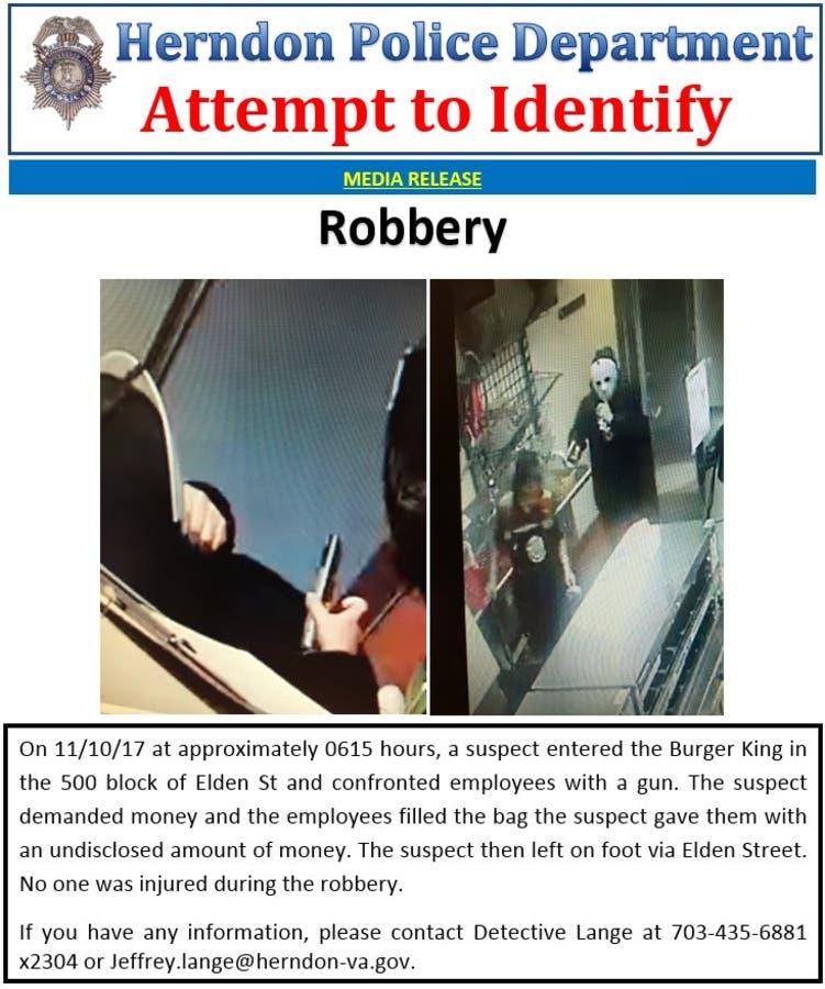 HERNDON, VA -- Police are looking for an armed man wearing a mask reminiscent of horror villain Jason Voorhees who robbed a Burger King early Friday morning in Herndon.