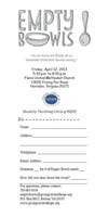 Empty Bowls Fundraiser-Friday, April 12, 2013 from 5:30pm to 8:00pm at Floris United Methodist Church in Herndon. Pre-event tickets are $20 and tickets at the door will be $25. Tickets are limited.