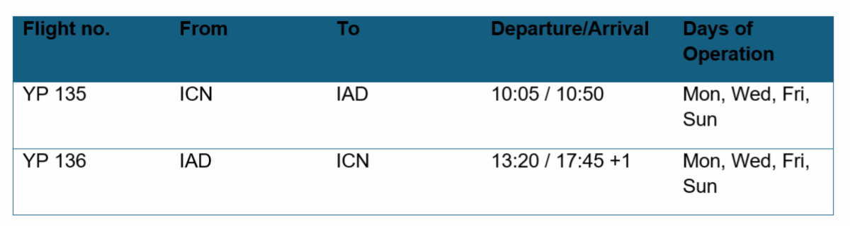 The flights will operate four days per week year-round on a Boeing 787 configured for 320 passengers in premium economy and economy classes, according to a release. Dulles International Airport is Air Premia’s fifth U.S. destination and one of only two on the East Coast.