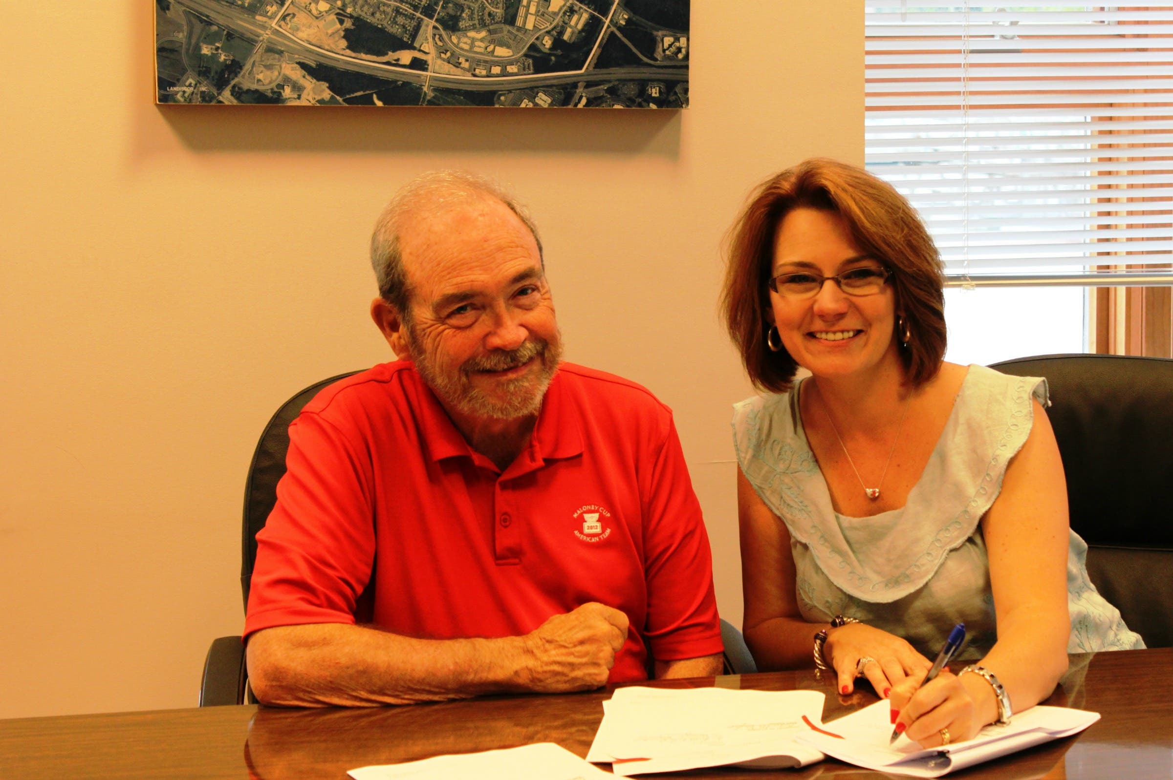 Image: Mayor Lisa Merkel, at right, signs the land contract on Wednesday with landowner Ronald K. Ashwell (Town of Herndon).