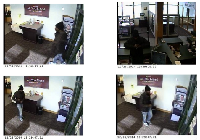 Police describe the suspect as a black male, approximately 5’9” with a medium build, wearing a dark green jacket, faded blue jeans, light colored sneakers and a black knit hat entered the main lobby of the bank.