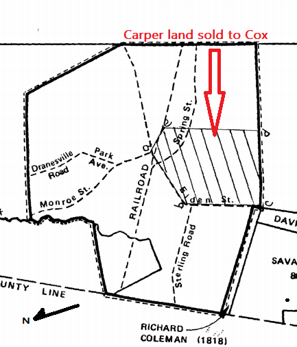 In 1851, John Ford Hazard’s father, Thomas Hazard, his Uncle Thomas Cox, and some other friends, looked at the land in Virginia, in the vicinity of Washington, D.C. Thomas Cox bought about 380 acres of land from Thomas Carper, in an area that would later be called Herndon. Meanwhile, Thomas Hazard returned to New York to take care of the business of selling his farm there. The farm that Cox had bought is generally surrounded by what is now Centreville Road, to south Elden Street, continuing on Elden Street to Van Buren Street. This property now includes areas such as the Chandon neighborhood, the Herndon Middle School property, and the neighborhoods along the west side of Van Buren Street. A corner of this land was located where the present-day Elden Street intersects Spring Street and the Washington & Old Dominion (W&OD) trail.
