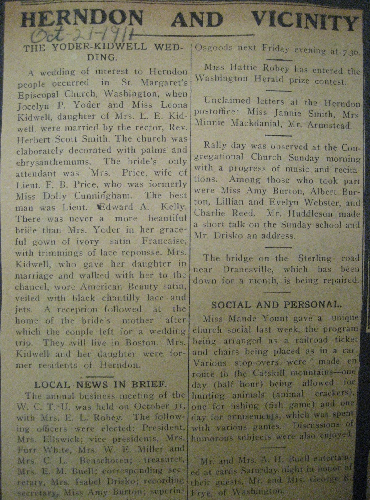 A local section from a 1911 Fairfax Herald. Herndon Historical Society.