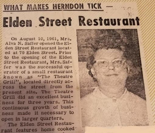 In 1961, after the drug store left the first floor of the original east side of the building, it became the Elden Street Restaurant, run by Alva Saffer. A Herndon resident and member of the Herndon Methodist Church, Saffer had previously operated “The Theatre Grill,” (later known as the Hornet’s Nest) for three years out of the old Herndon Theatre building (now The Upholstery Shop), located directly across Elden Street. With her growing business, she was looking for a larger space. She wanted to be able to serve larger groups such as families and Herndon organizations that wanted to have group lunches or dinners. Saffer served breakfast, lunch and dinner. One of her nieces was a waitress. Aside from locals, many of her customers were also construction workers who were working on building Dulles Airport. People remember the restaurant as having inexpensive meat and potatoes type of food and beer. Music played on a jukebox. One Herndon resident remembered: