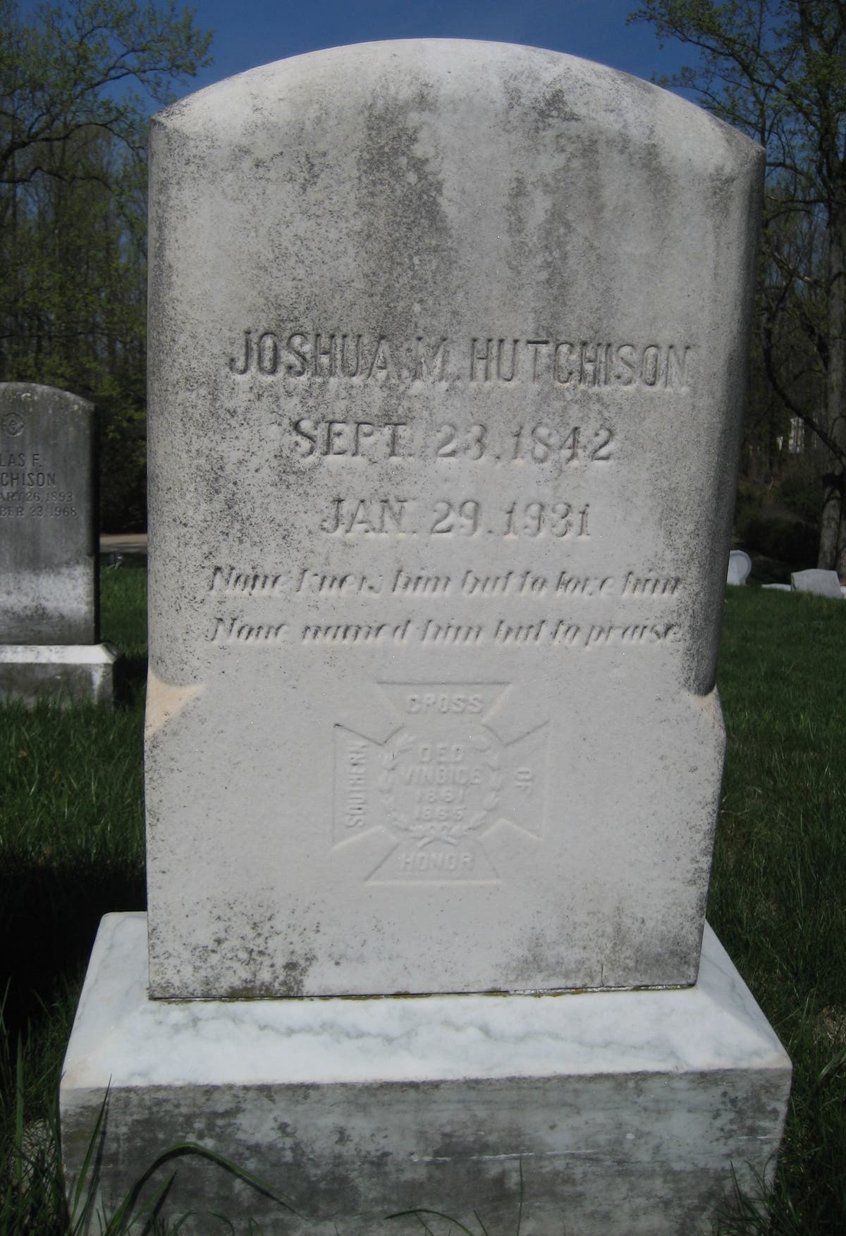 The story behind this gravesite was described in a 1990 issue of the Herndon Observer newspaper. The two soldiers had been buried in the front yard of a farmhouse once owned by Civil War veteran Joshua M. Hutchison who lived in the Pleasant Valley community along Route 50. Joshua Hutchison died in 1931 and is buried in Chestnut Grove Cemetery. His tombstone says, “None knew him but to love him. None named him but in praise.” Strikingly, the Southern Cross of Honor symbol is also etched into his tombstone.