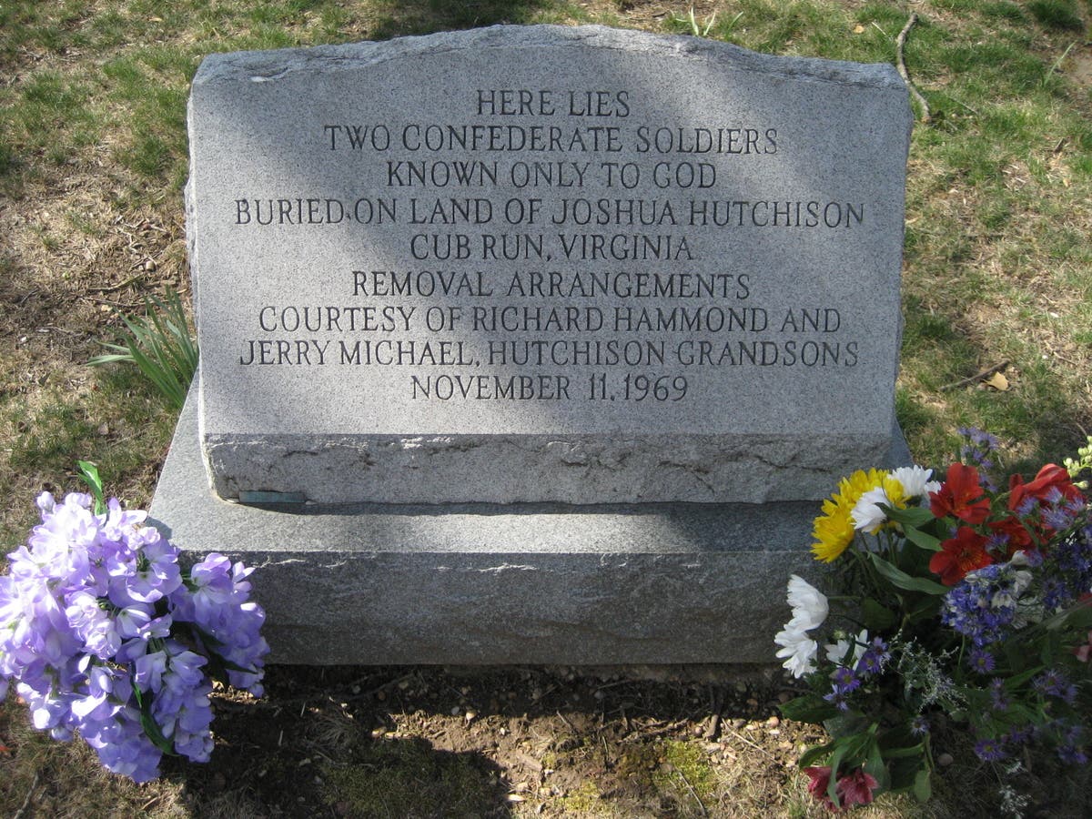 “Here lies two Confederate soldiers, known only to God, buried on land of Joshua Hutchison, Cub Run, Virginia. Removal arrangements courtesy of Richard Hammond and Jerry Michael, Hutchison grandsons. November 11, 1969.”