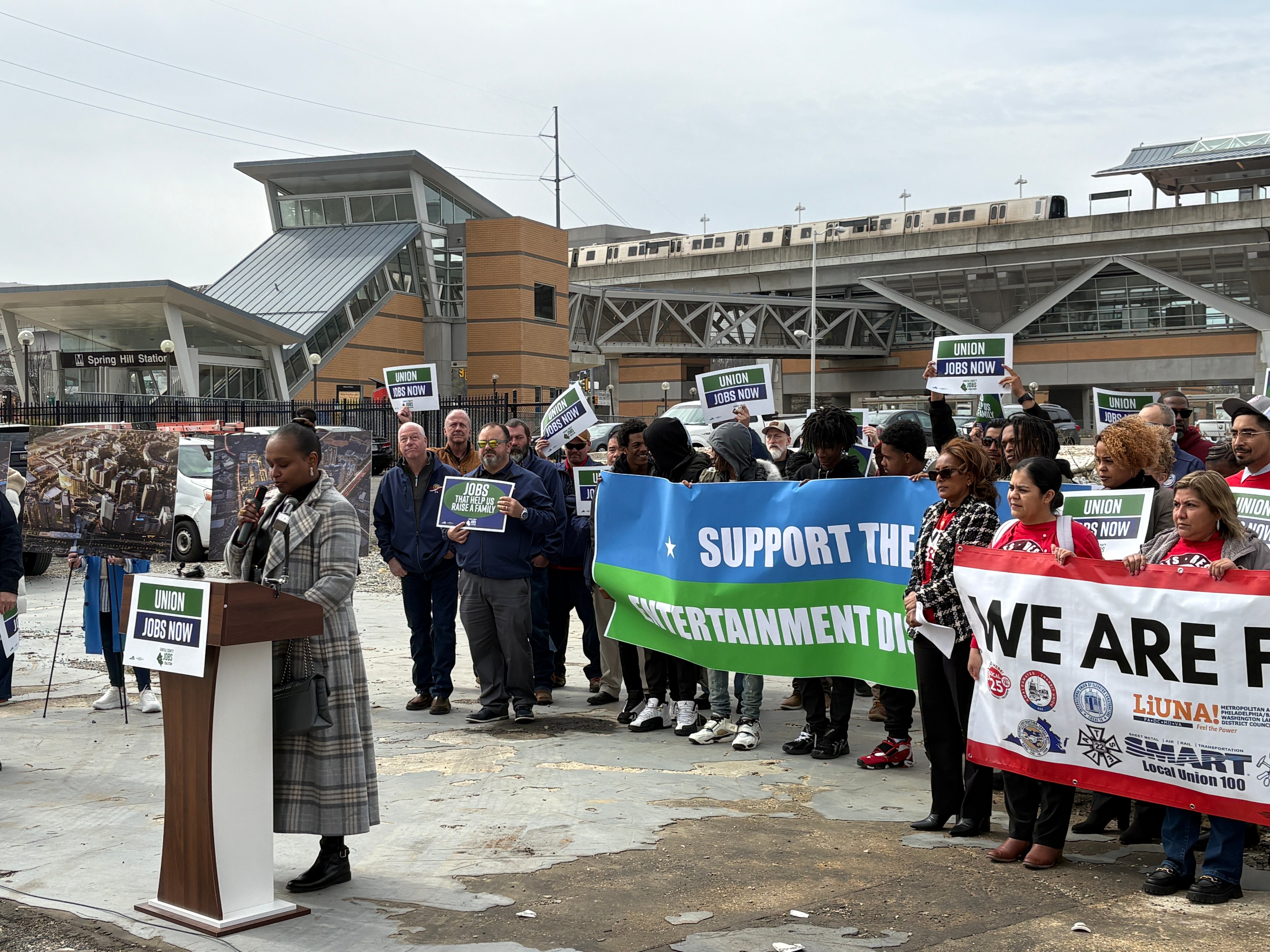 TYSONS, VA — A coalition of labor unions from Northern Virginia gathered Wednesday on a vacant lot near the Spring Hill Metro station to urge Gov. Abigail Spanberger to sign legislation that could pave the way for a massive entertainment district and casino in Tysons.