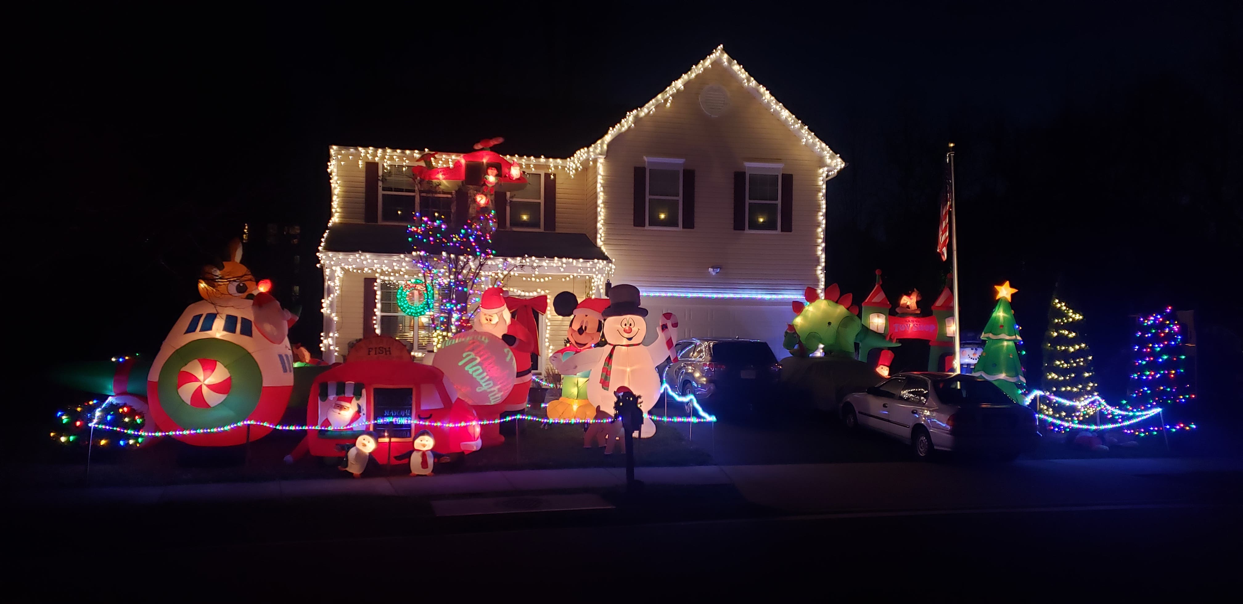 1036 Bakersfield Lane, Fredericksburg, VA: This home features 16 inflatables and lights on the house and shrubbery. One of the highlights is an inflatable Stegosaurus dinosaur on top of a car wagging his tail. The display features continuous Christmas-themed music. The inflatables are turned on during the day, and the lights are on at night until around 11 p.m. daily. In cases of moderate to heavy rains or windy conditions, inflatables will not be on but lights will.