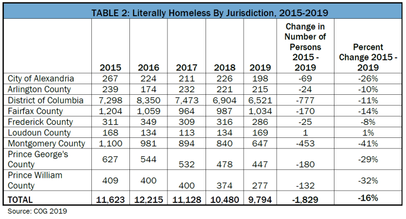 The 9,794 people experiencing homelessness in the DC region is the lowest since the point-in-time count began in 2001. There has also been progress of formerly homeless people who have secured permanent housing. In 2019, 1,290 more people were in permanent housing than in 2018. The number of formerly homeless people for the region is 23,172.