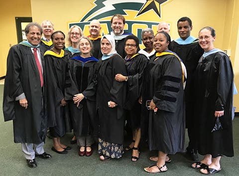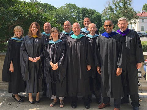 Administrators are decked out in caps and gowns to celebrate the high school graduation on June 15.