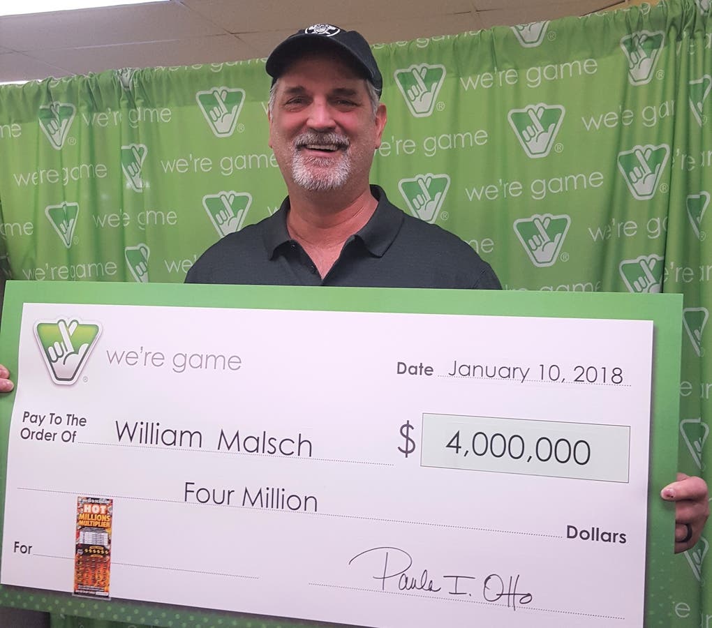 That would be $4 million. Malsch scratched his way to that sum in the Virginia Lottery's "Hot Millions Multiplier" game. You might no be surprised at his first reaction, according to the Virginia Lottery: "It's not real." He bought the winning ticket at Shop N Save, 609 East Main Street, which will receive a $10,000 bonus.
