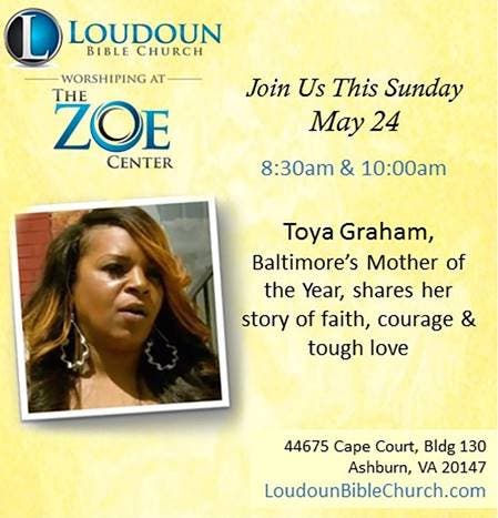 Almost everyone has heard the story about the Baltimore mother, Ms. Toya Graham, who pulled her son from the riots a few weeks ago. She will be sharing her testimony this Sunday, May 24 at The Zoe Center during Loudoun Bible Church’s 8:30 and 10 am Services.