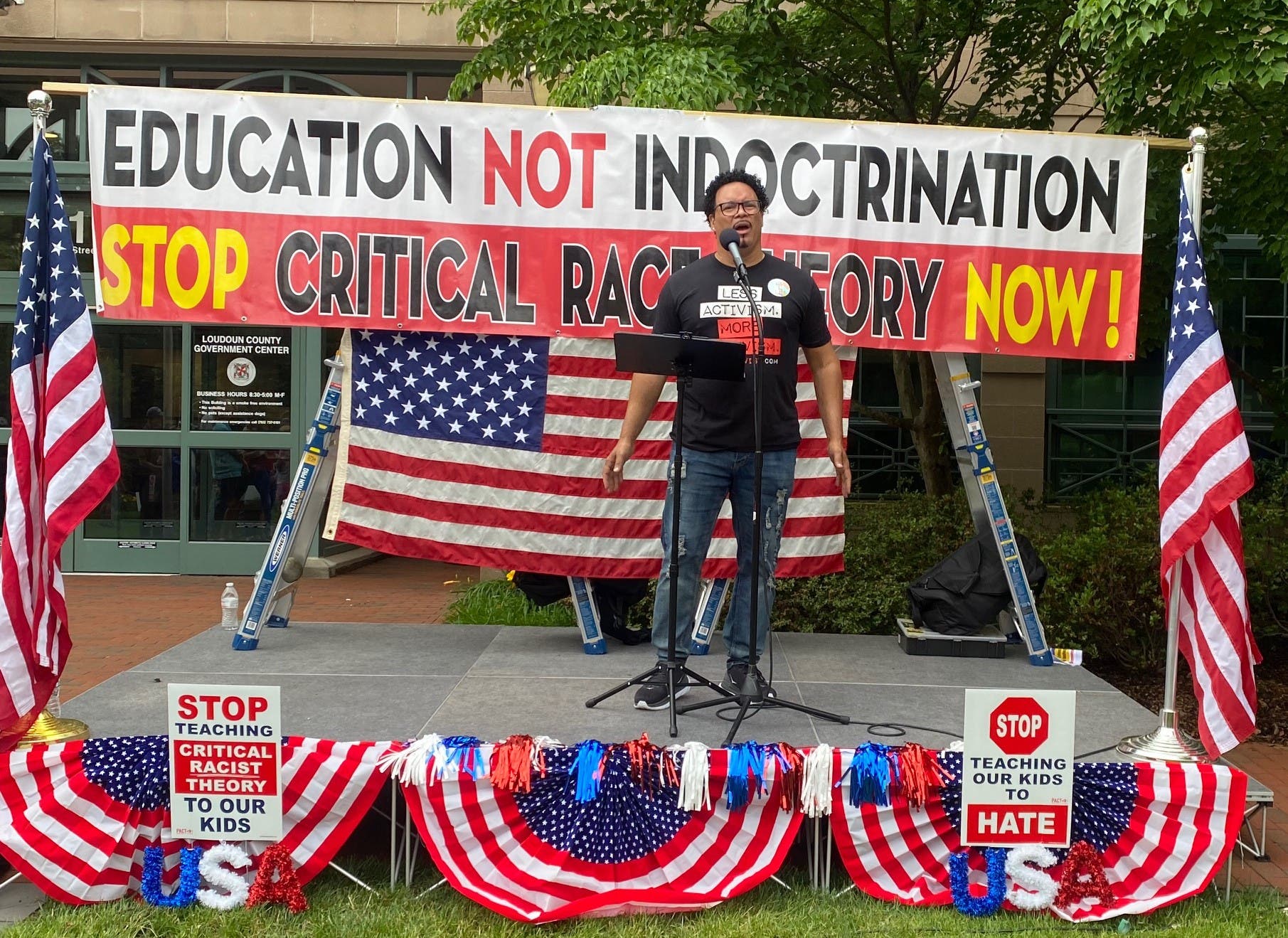 Speakers at the “Education, Not Indoctrination" rally outside the Loudoun County Government Center accused county school leaders of implementing the principles of critical race theory, an academic theory developed in the 1970s and 1980s that posits societal and structural racism exists in institutions across the country.