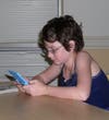 Later, she suddenly dashed across the room and sat down near where the boys were playing, although she still kept a little distance and continued playing her hand-held game.