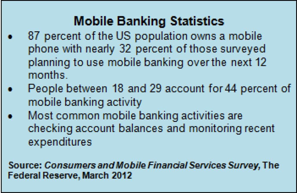 In the U.S., 87 percent of the population owns a mobile phone and as of March 2012, 106 million of those are smart phone users. Currently, 29 percent of mobile phone owners utilize mobile banking, but according to Javelin Strategy & Research, over the next five years more than half of mobile phone owners will use the technology.