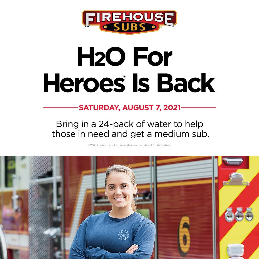 On Saturday, Aug. 7, Firehouse Subs restaurants will offer one medium sub to each customer who brings in at least one unopened, 24-pack of any brand of bottled water. The water will be donated to local fire and police departments, emergency victims, and senior and community centers.