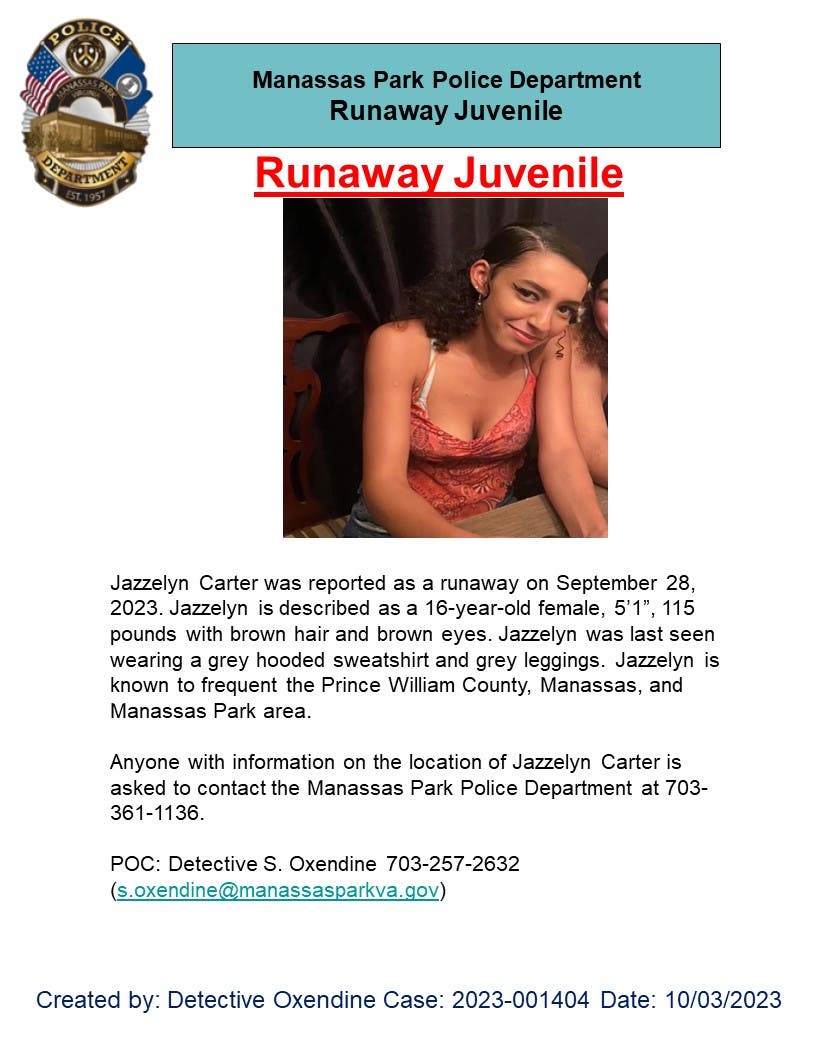 Jazzelyn Carter ran away from home on Sept. 28, the Manassas Park Police Department said. Authorities are asking for the public's help in finding her.