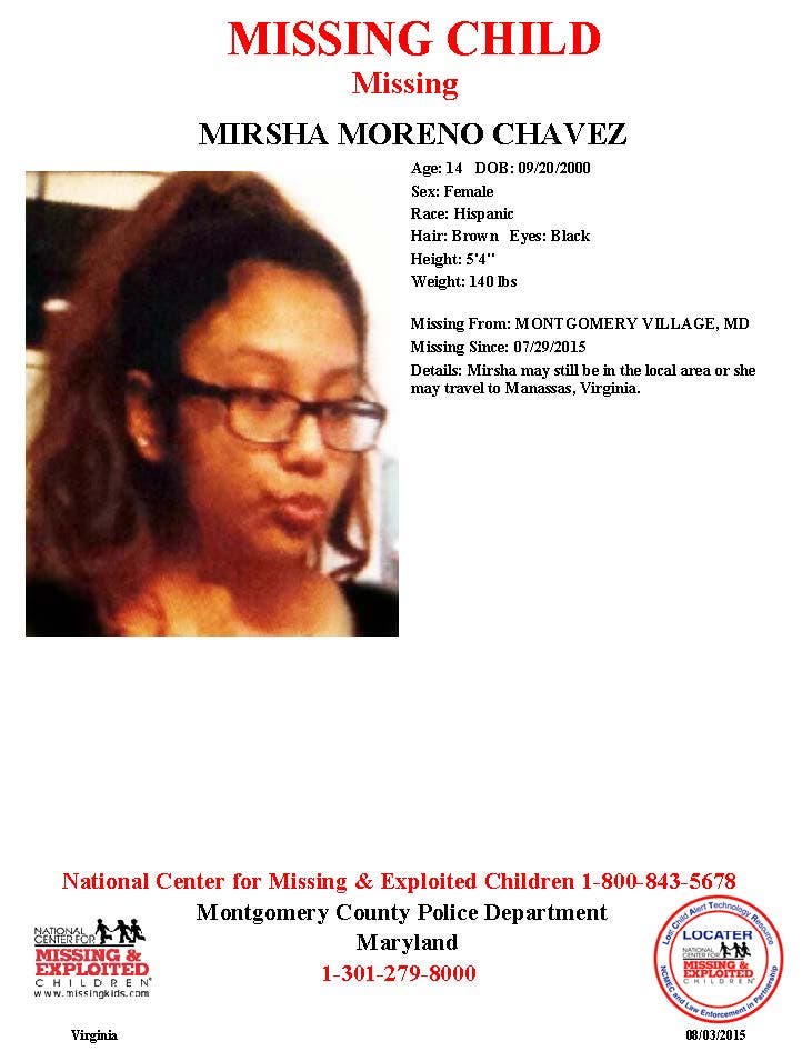 The bulletin is for Mirsha Moreno Chavez, a 14-year-old girl who has been missing since last Wednesday and was last seen in the area of Montgomery Village, Md., according to the center. She is described as Hispanic, with black eyes and brown hair, 5 feet 4 inches tall and weighing 140 pounds.