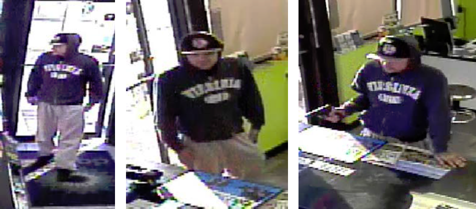 The police on Tuesday released surveillance photos of the robbery suspect that were taken at the BP service station at 7111 Sudley Road. They describe the suspect as a white male, between 25 and 29 years of age, 5 feet 7 inches tall and weighing 150 pounds, with a thin build and a tattoo on his neck and hand.