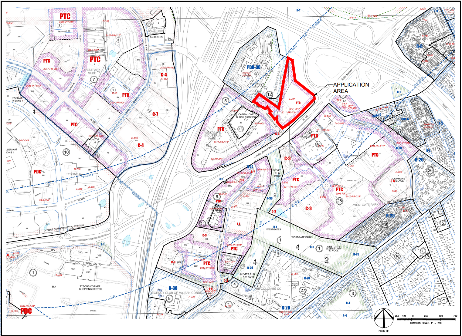 The property, which is zoned as a Planned Tysons Corner Urban District, currently houses a baseball field and a public park. A garage to service the area is also in the works. (Fairfax County)
