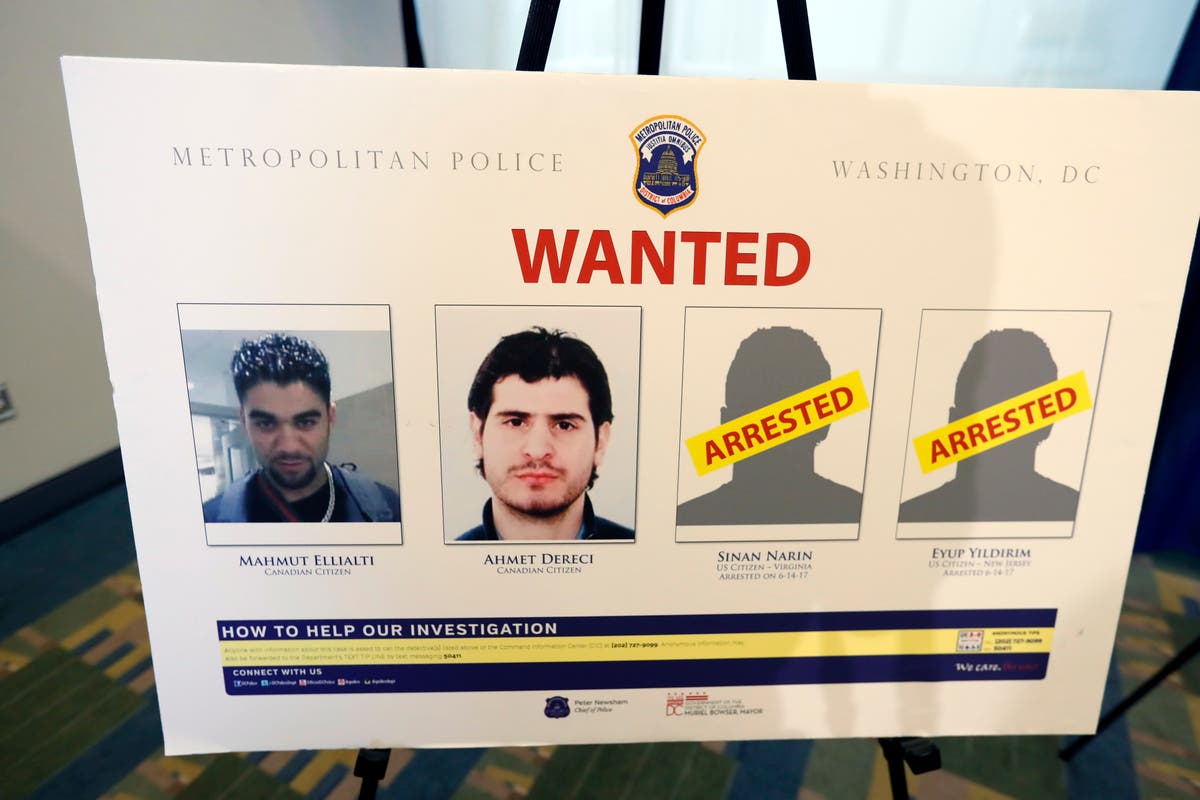Pictures of people facing criminal charges are seen after a news conference in Washington, Thursday, June 15, 2017, about an May 16, 2017, altercation outside the Turkish Embassy in Washington during the visit of the Turkish president. Police say they've issued arrest warrants for a dozen Turkish security agents and two others accused of taking part in a violent altercation May 16 as Turkey's president visited Washington. (AP Photo/Alex Brandon)
