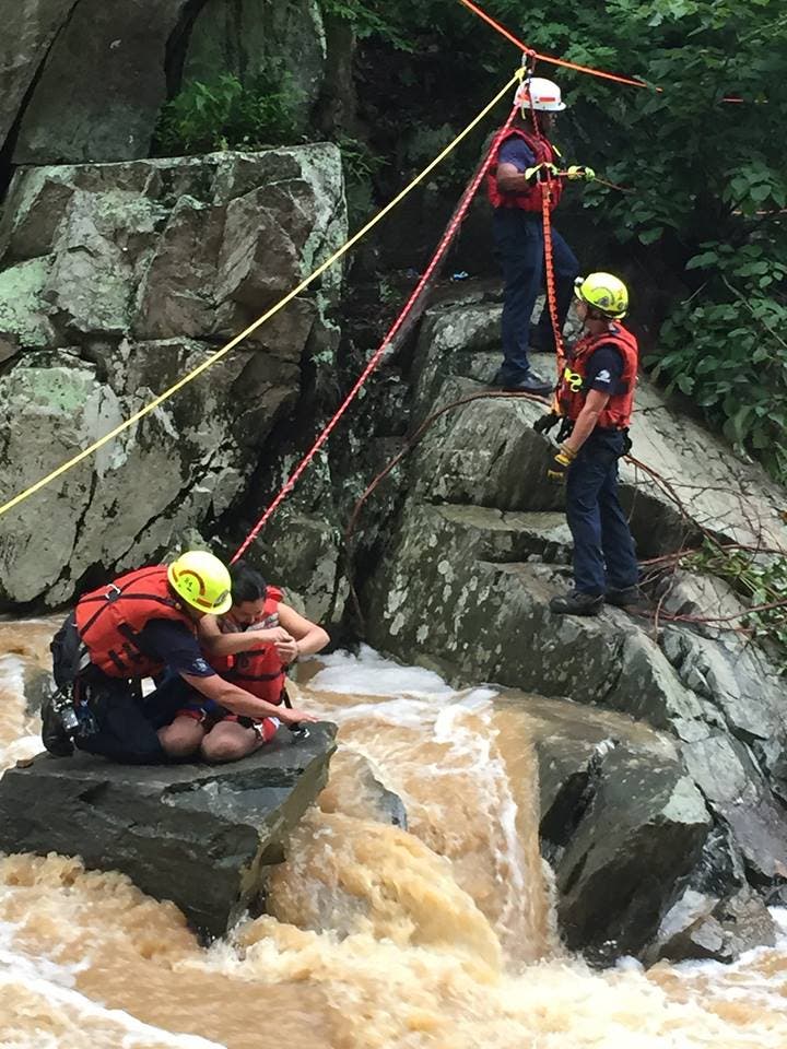 The storm caused water levels to quickly rise, stranding the woman on a rock in the middle of the river without a life jacket.