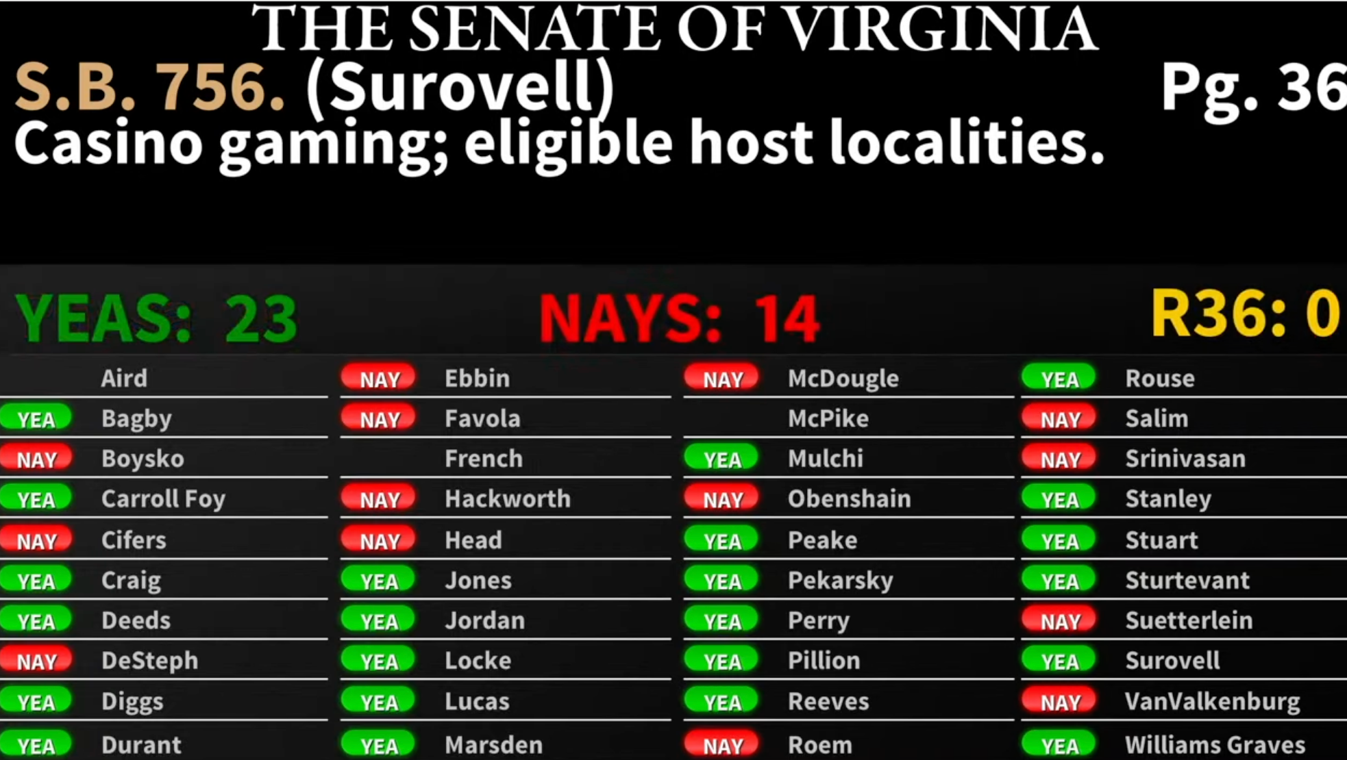 On Tuesday, the Senate Committee on Finance and Appropriations recommended SB756 with a substitute to the full Senate for consideration. The substitute removed the requirement that a casino would be built in Tysons, which made all of Fairfax County as a possible location for any casino proposal.