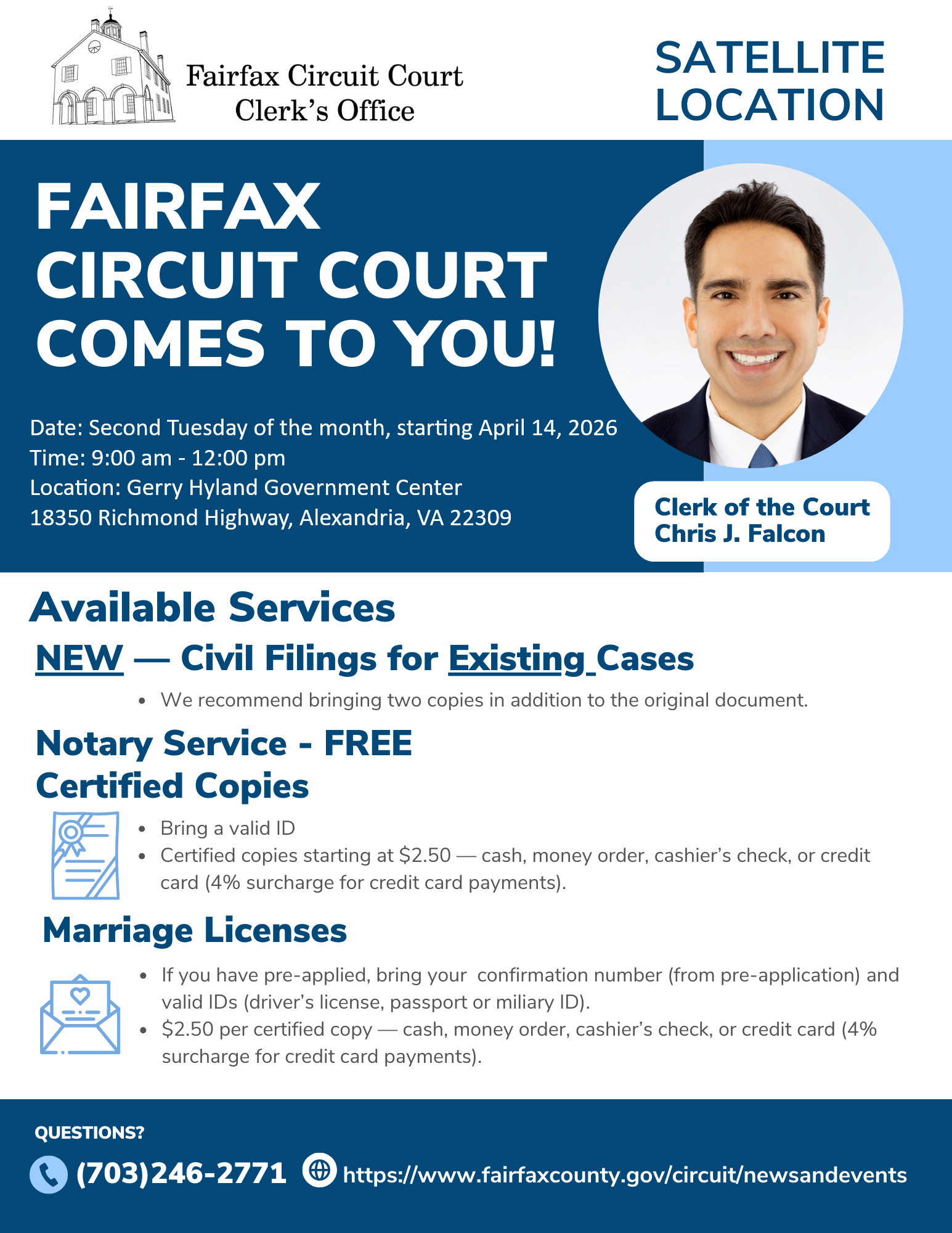 Services offered at this new location will include marriage license issuance, certified copies of court records, and free notary services. Civil filings into existing cases will also be available. The Gerry Hyland Government Center is located at 8350 Richmond Highway in Alexandria.
