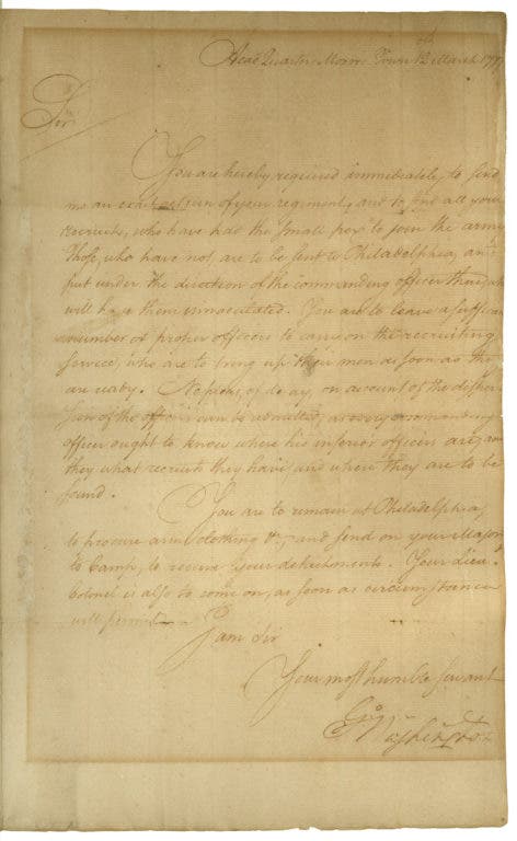 The manuscript ordering the inoculation of troops was written by aide-de-camp Alexander Hamilton and signed by George Washington in 1777. Although it is brief, the order demands that one of Washington's regimental colonels gather all his men and divide them into two groups: those who had been inoculated against smallpox or who had survived the disease, and those who had not been inoculated. Those men in the former group were sent to join the main army in Morristown and those in the latter group were sent to Philadelphia to be inoculated. Similar letters were sent to other regimental colonels.
