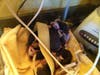 Animal control officer Daniel Cook cradles a baby opossum and places it inside a cardboard box atop a warmed blanket, along with its nine siblings.