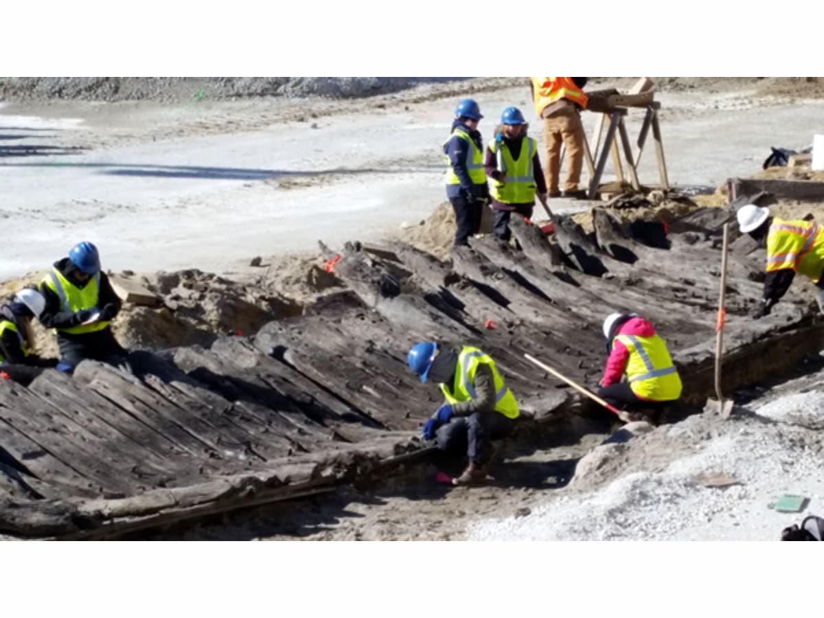 The 50-foot ship was discovered in late 2015 as Hotel Indigo broke ground on Union Street near the waterfront. A 260-year old warehouse was also uncovered a few months before. Archaeologists had excavated the ship in January 2016, and it has been stabilized in tanks of water until it could undergo professional conservation.