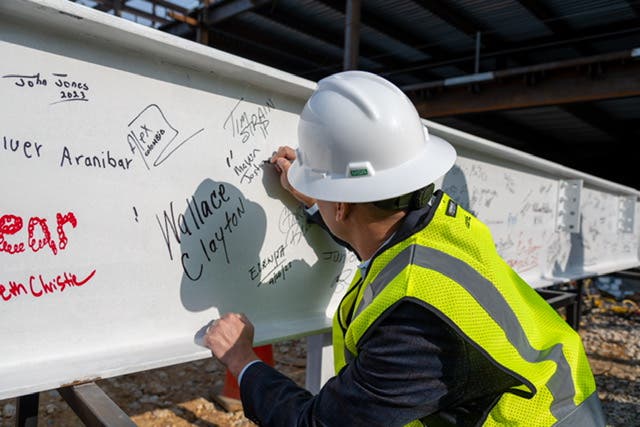 Alexandria city and school district officials celebrated the topping out of the expansion, which signifies the final piece being placed on top of a new building. To mark the milestone, officials signed the structural beam that will top the new Minnie Howard Campus building.