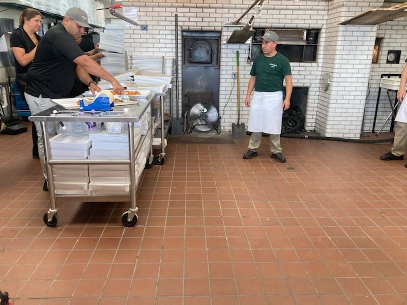To make a Frank Pepe's pizza, it takes a team of staff to prepare the dough, "decorate the pizzas" with toppings, and take pizzas in and out of the coal oven using a 16-foot-long paddle.